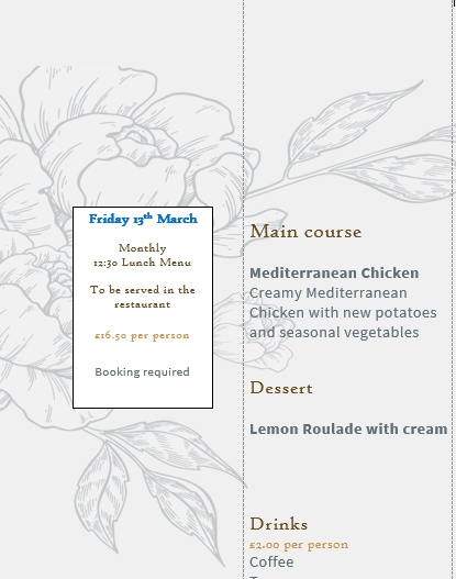 Our monthly supper nights offer different menus on each occasion.